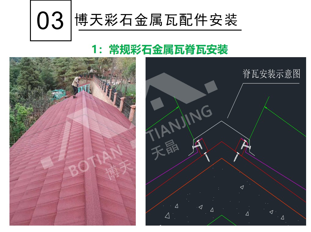 以上內容就是關于“彩石金屬瓦配件安裝 屋面脊瓦安裝教程”的詳細介紹了??赐旰笙嘈糯蠹以诎惭b脊瓦時知道該怎么去操作了吧。博天彩石金屬瓦適用任何建筑,像一些工業建筑,民用建筑,屋面建筑等,歡迎大家前來定制選購。